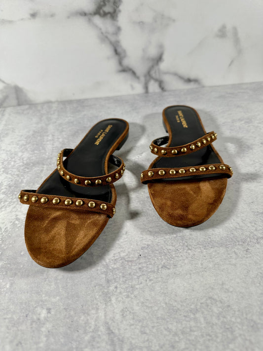 YSL Kiki Brown Suede Gold Studded Sandal Size 10